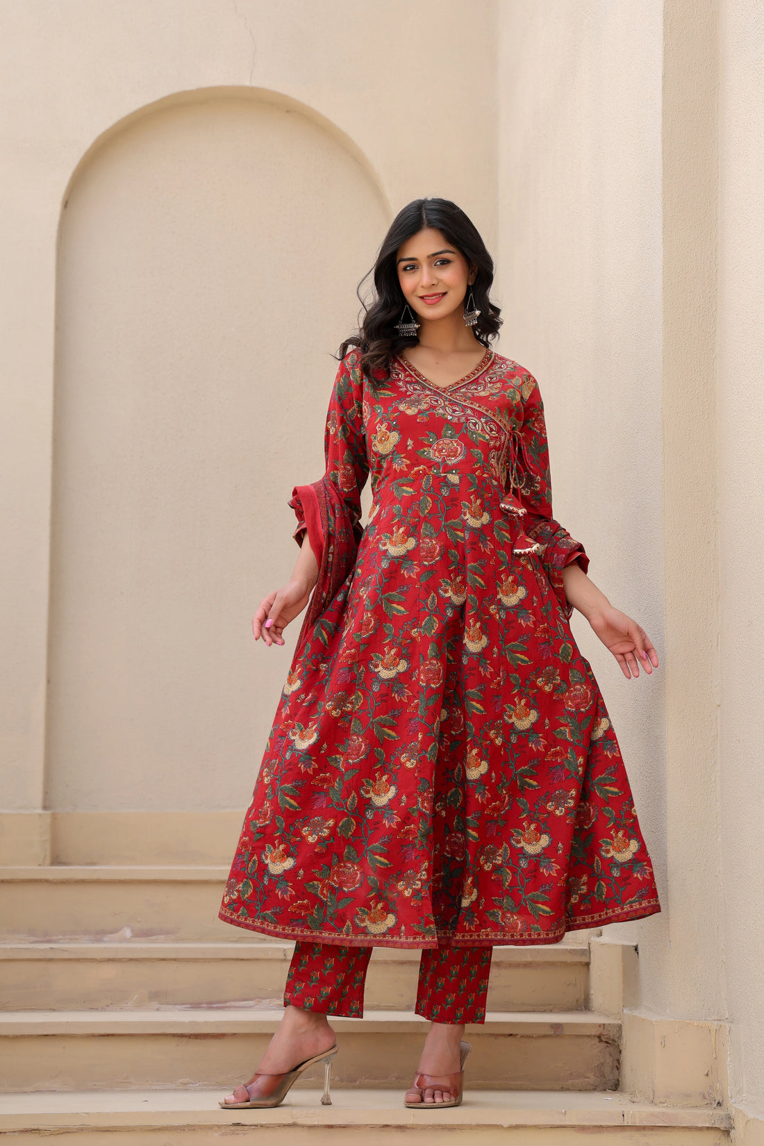 Elegant rust red Anarkali with floral print Intricate neckline detailing with embroidery Matching printed pants...
