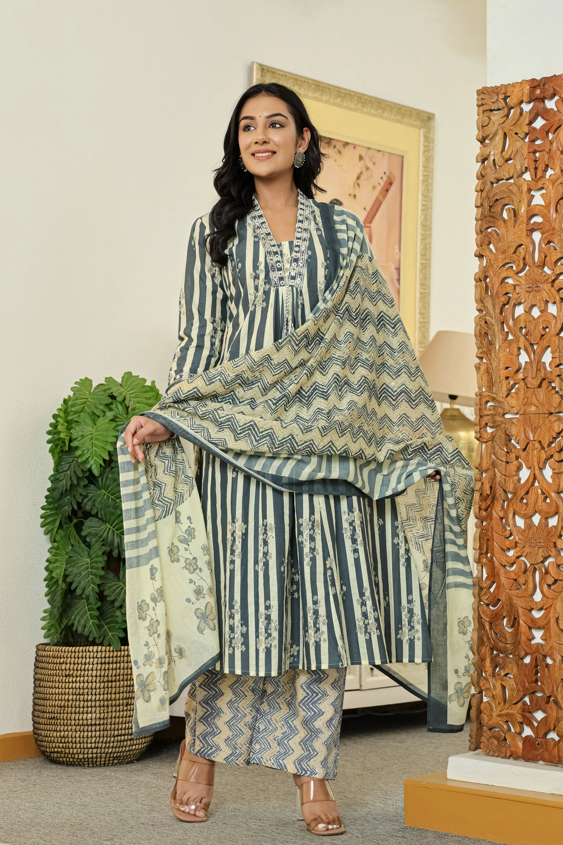 Grey Printed Cotton A-Line Kurta Pant Dupatta Set