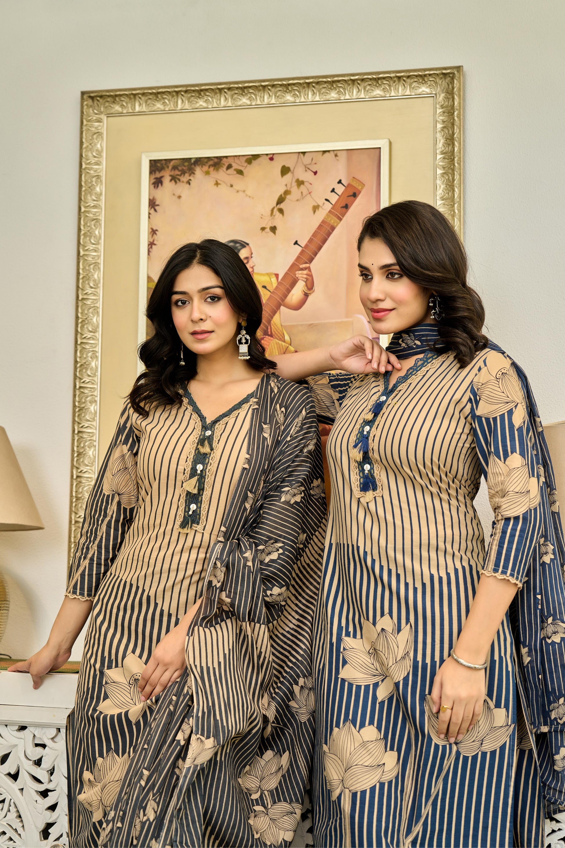 Design: Vertical stripes with intricate lotus prints for a taller, slimmer look
