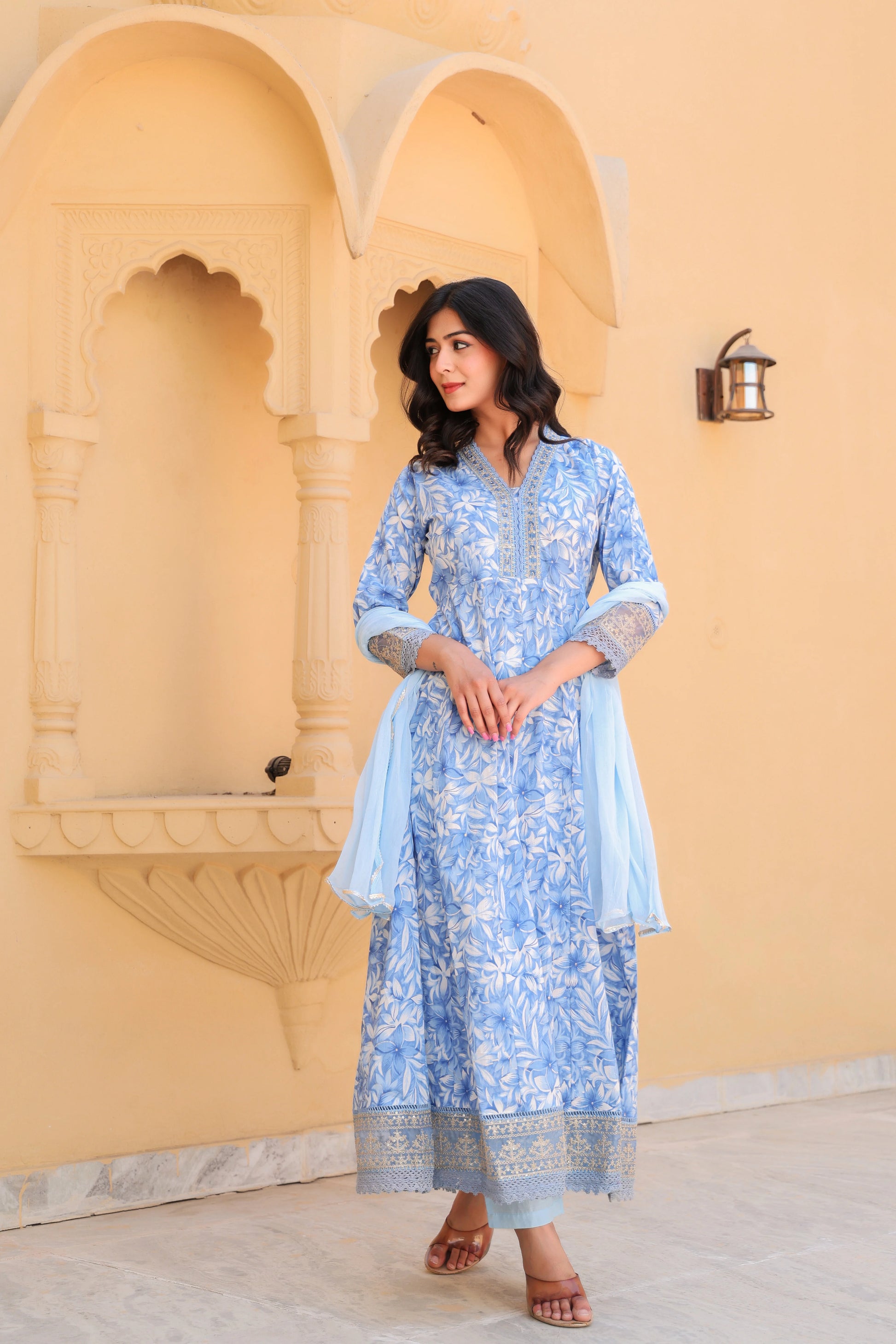๐ธ Elegant Floral Design: Soft blue Anarkali adorned with delicate white floral prints.