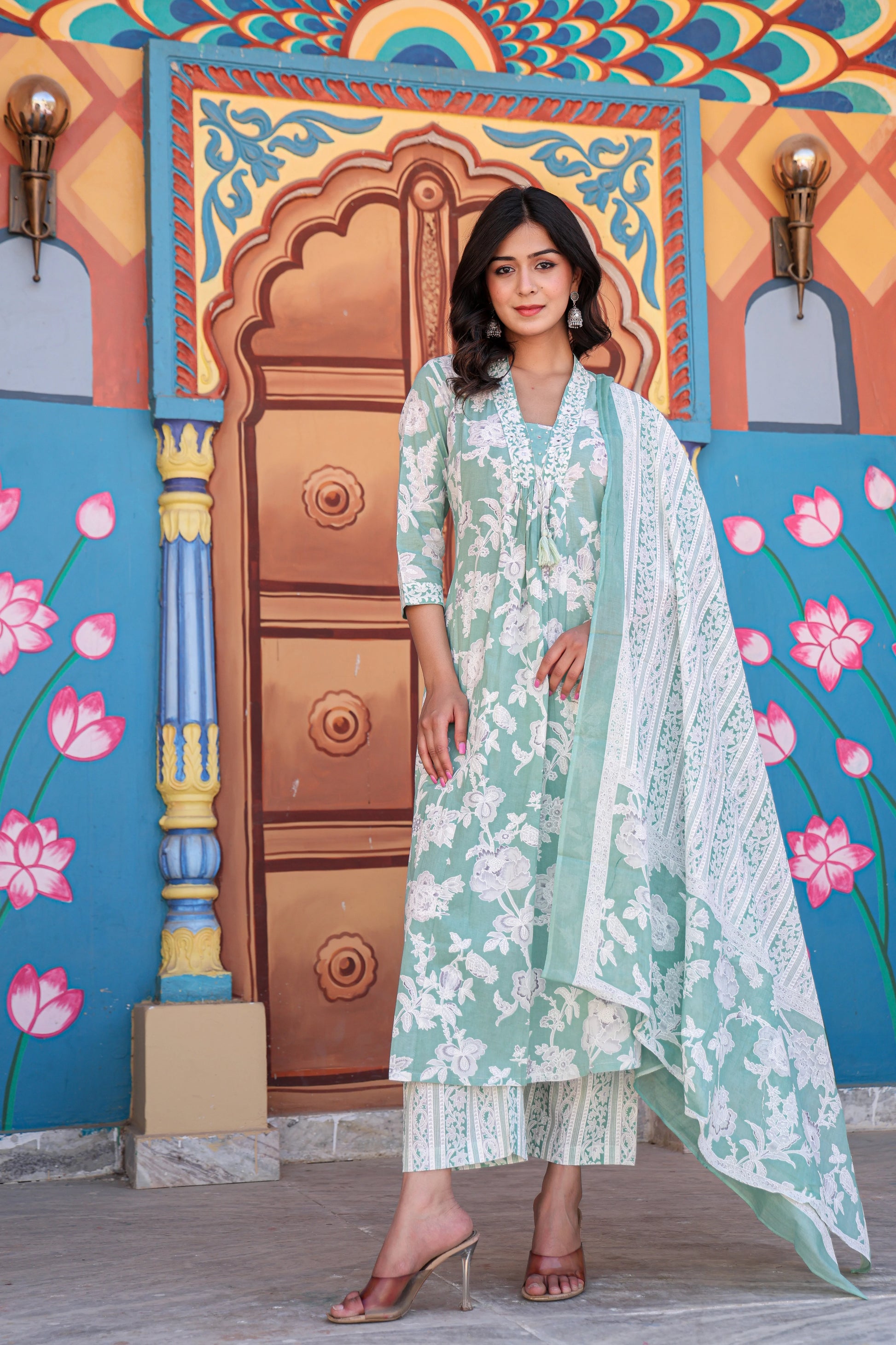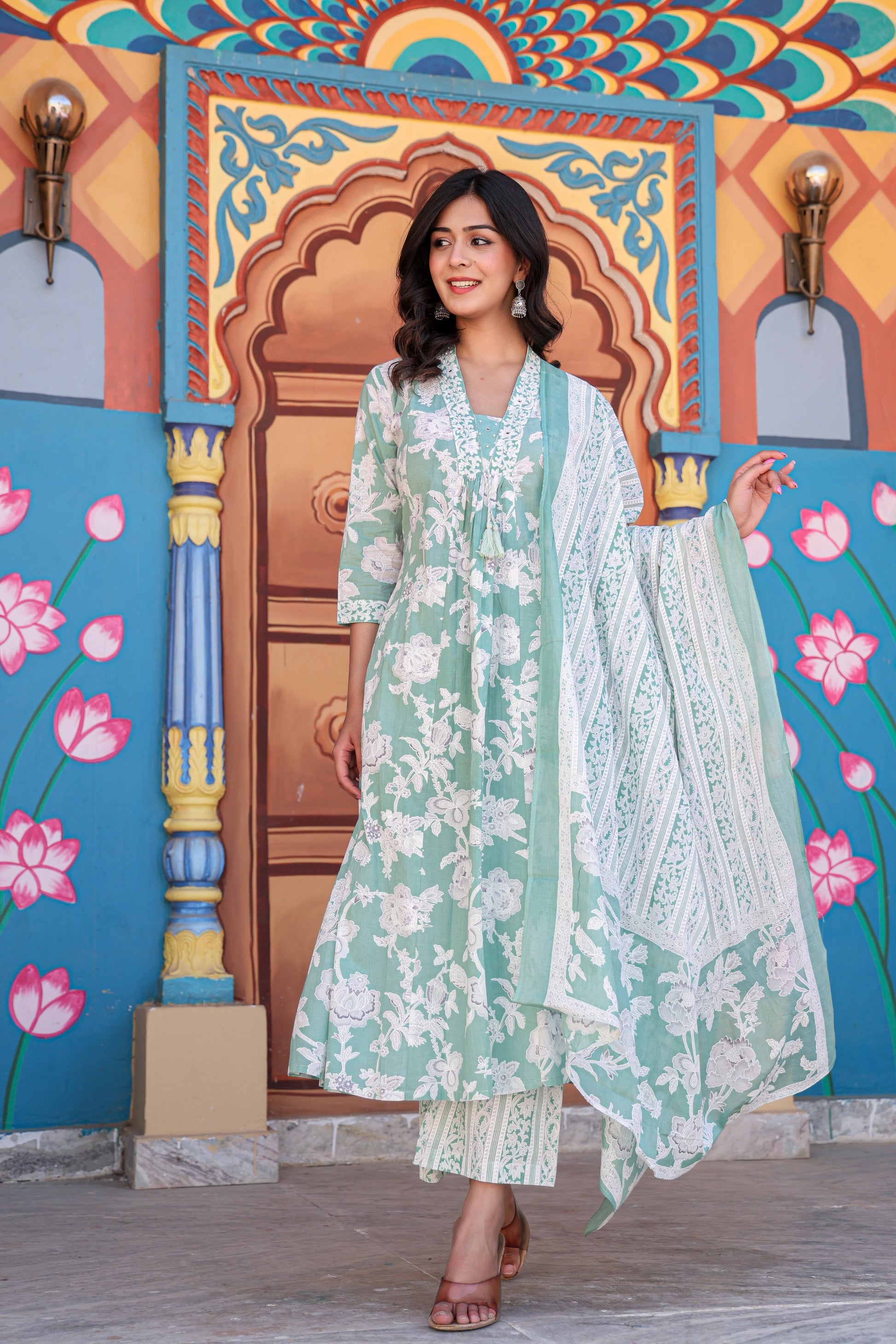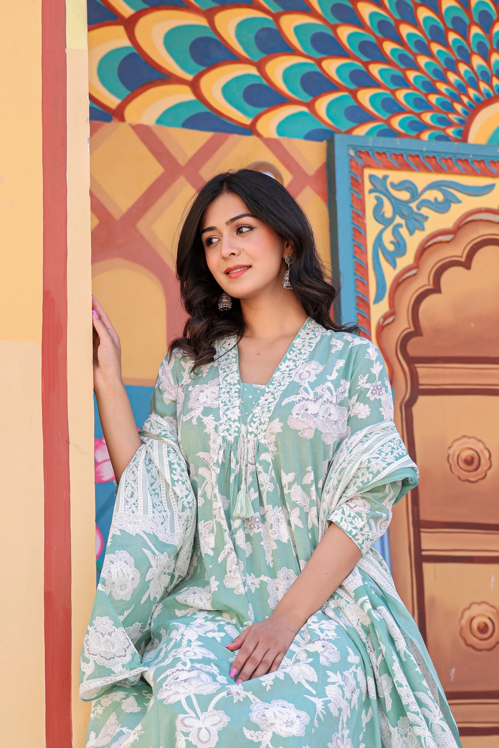 ๐ธ Elegant Floral Design: Soft blue Anarkali adorned with delicate white floral prints.