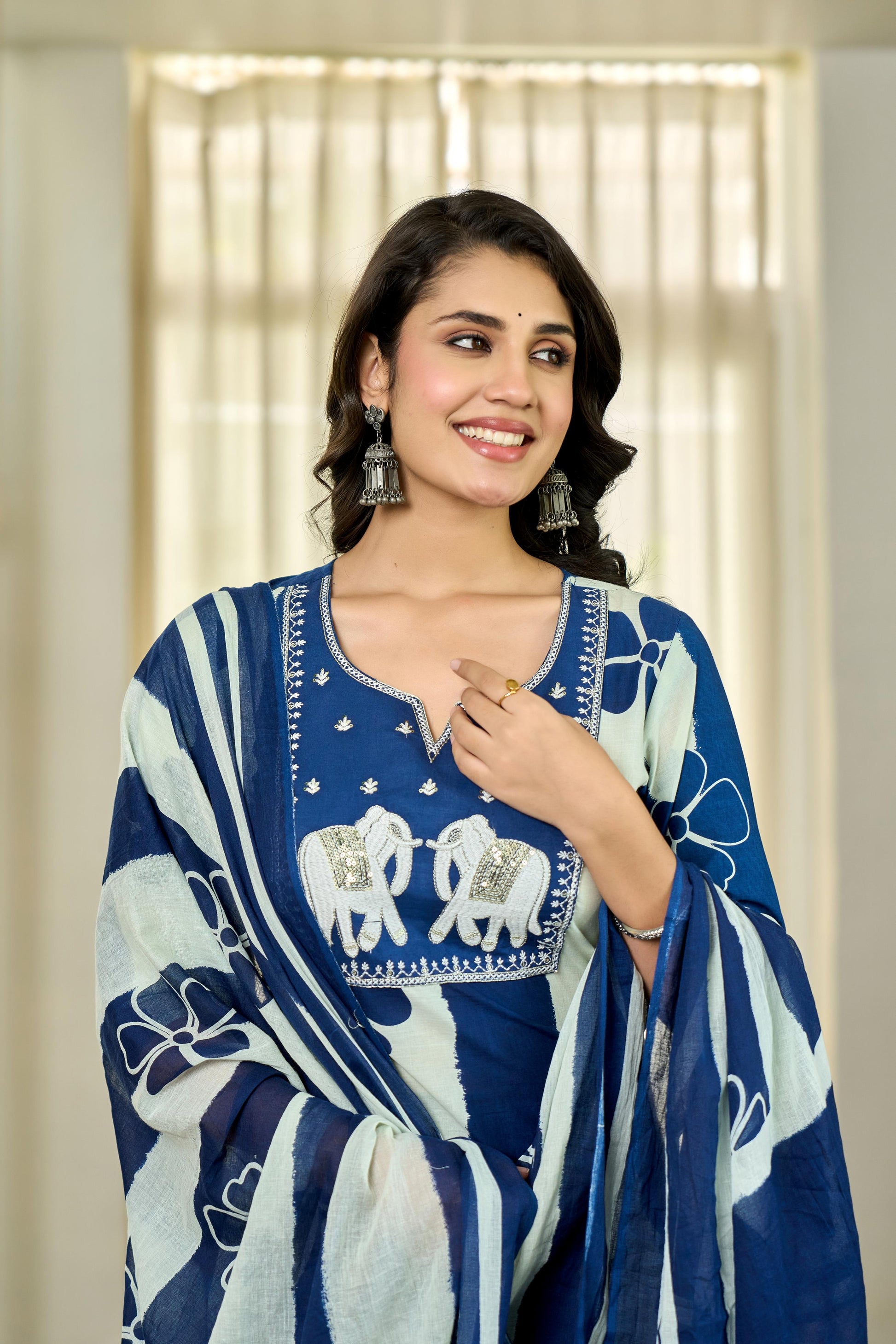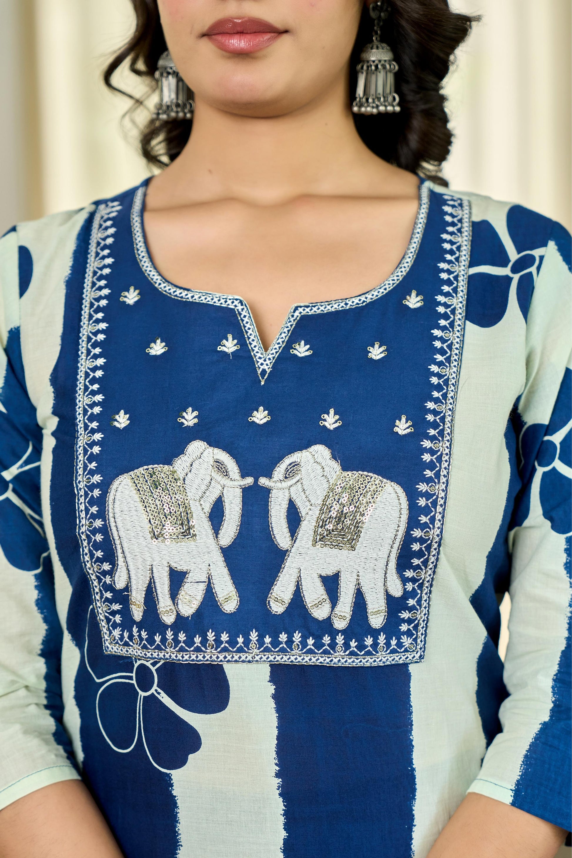 Elephant motif embroidery on the yoke for a touch of tradition