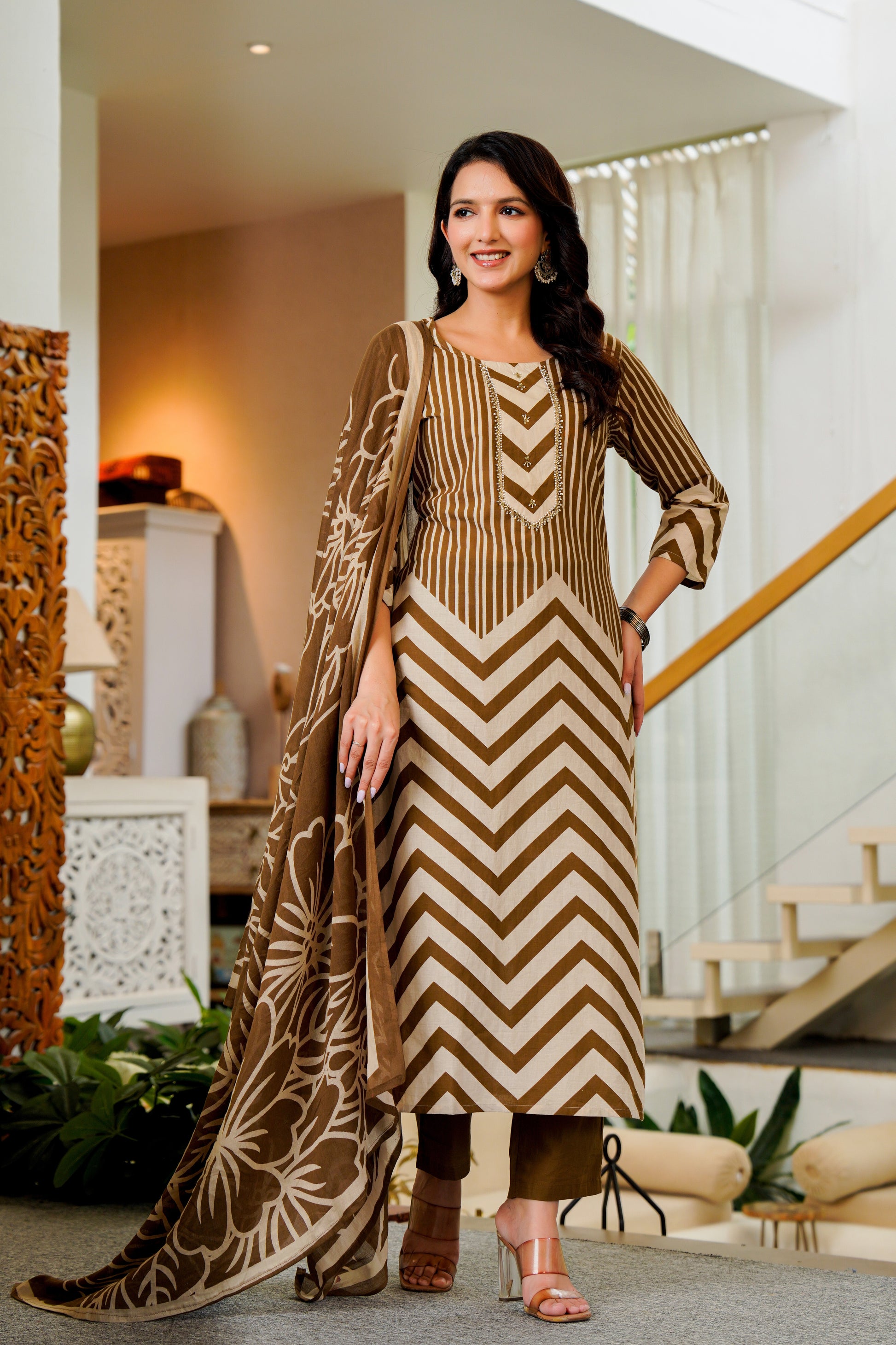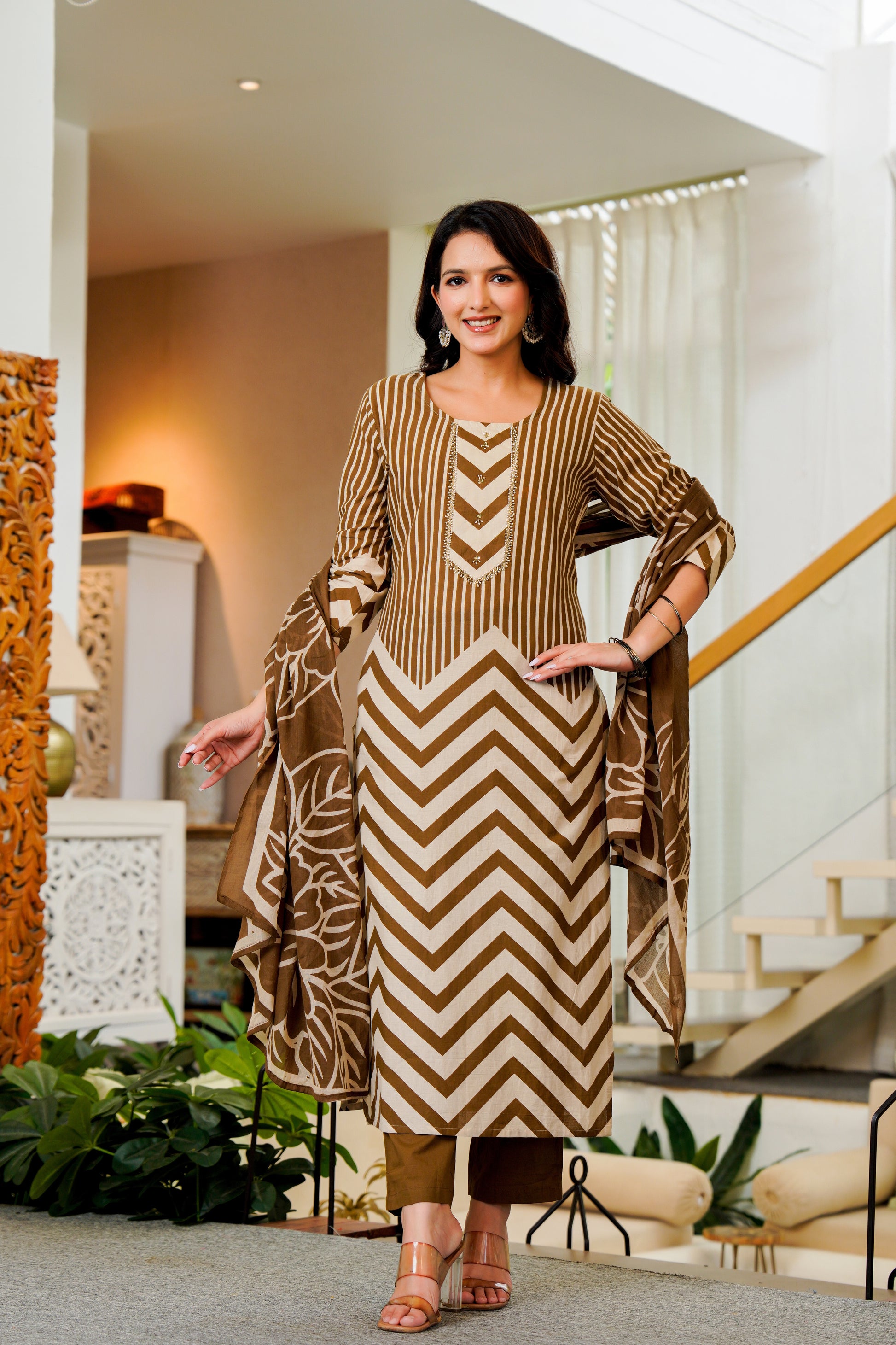 Statement Dupatta: Paired with a floral-printed dupatta that balances the geometric kurta with feminine charm.