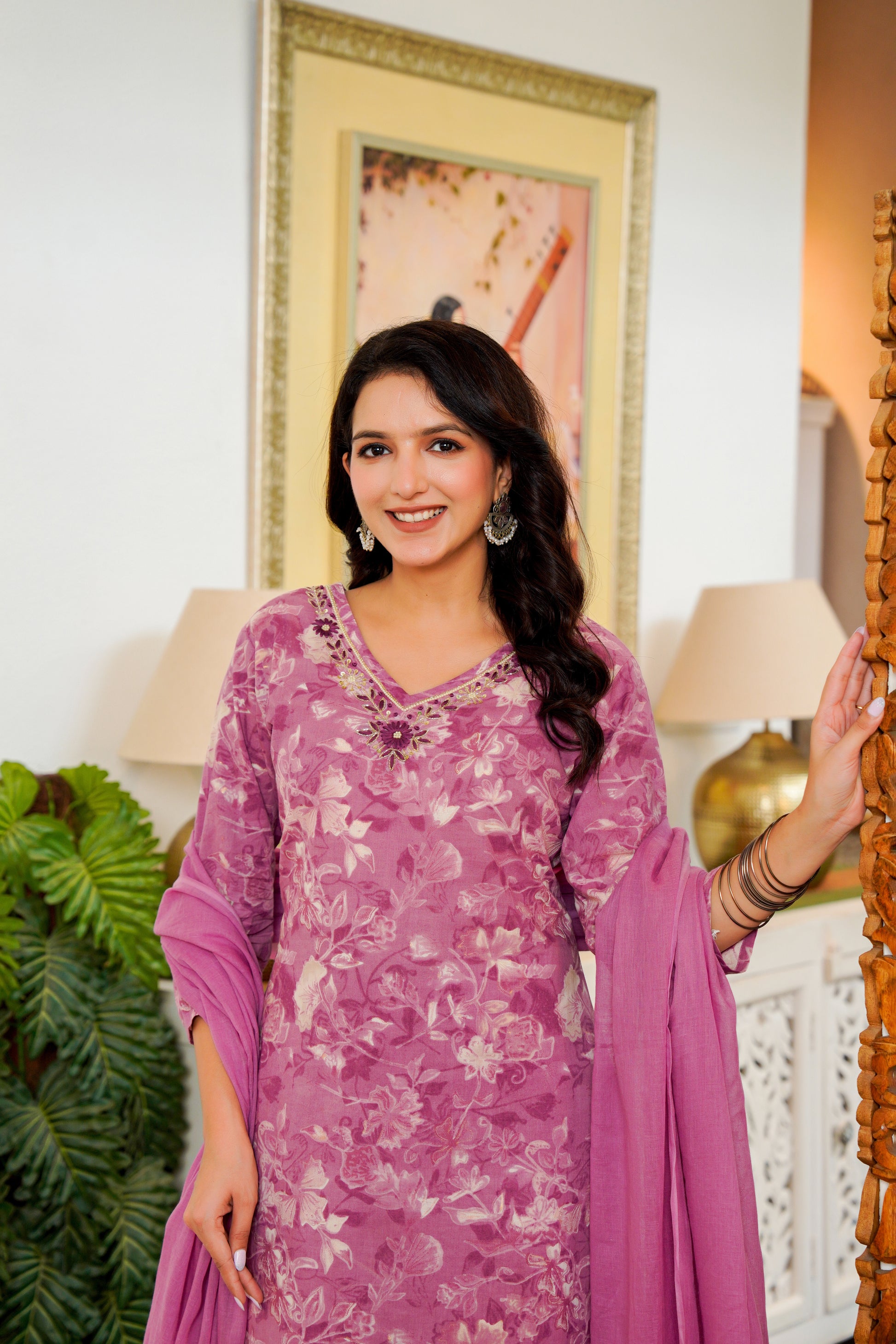 🌸 Elegant Charm: Mauve floral printed kurta paired with matching pants and a soft flowing dupatta for a refined ethnic look.