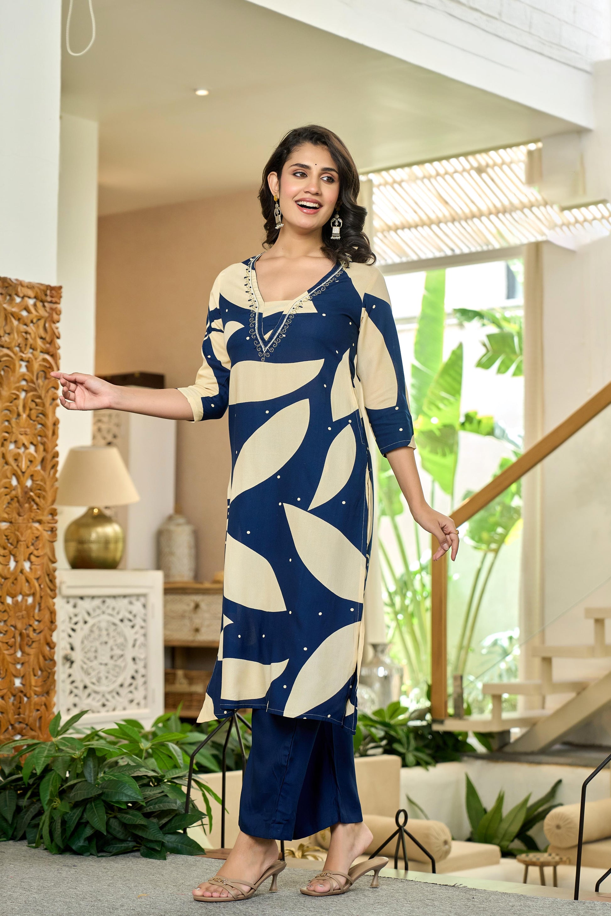 Design: Navy blue with oversized beige leaf motifs & dotted detailing