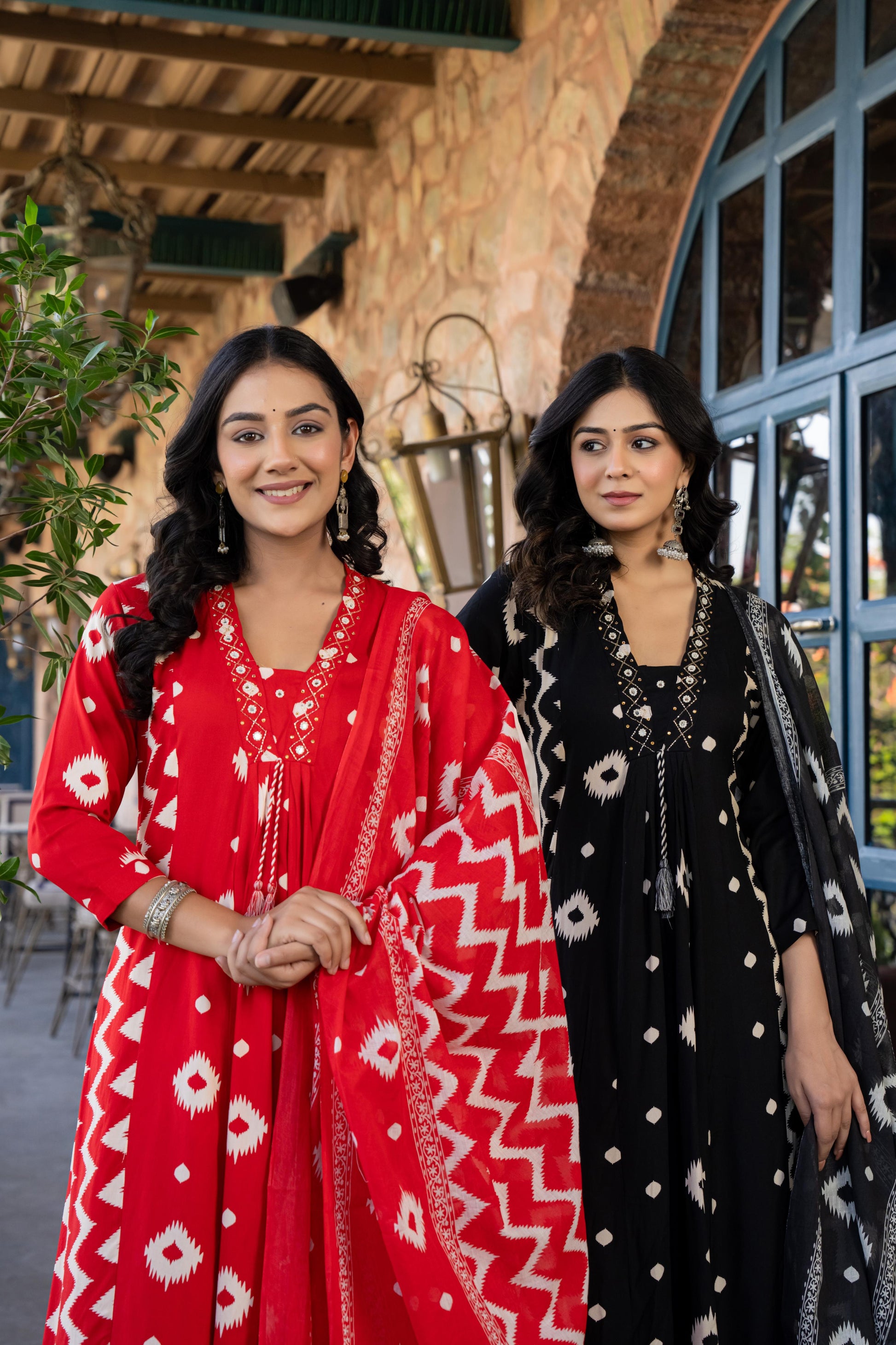 Make a bold ethnic statement with this black cotton kurta set featuring eye-catching Adda work on the neckline. Styled with ikat-inspired prints, the set includes a straight-cut kurta, solid black pants, and a coordinated printed dupatta—ideal for festive evenings and elegant casuals.