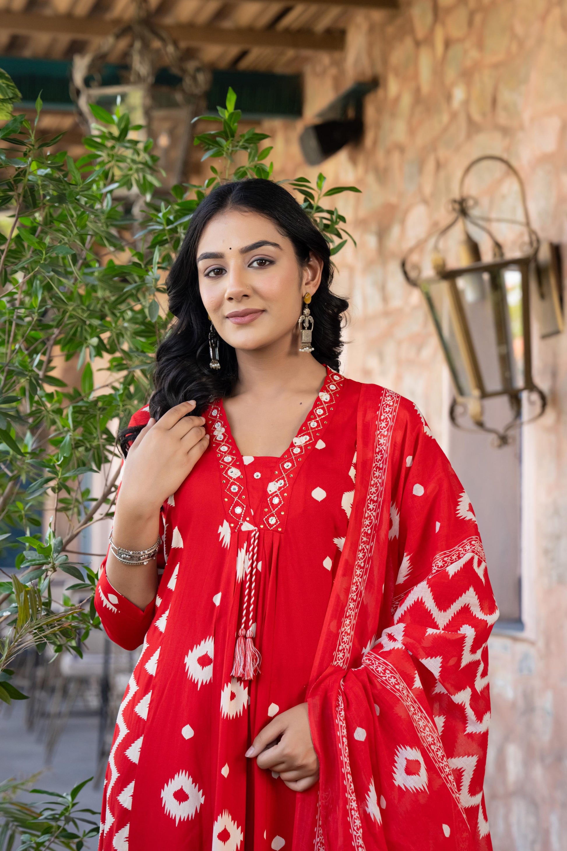 Ishmira Red :- Women Kurta Set with Dupatta | Adda Work Neck