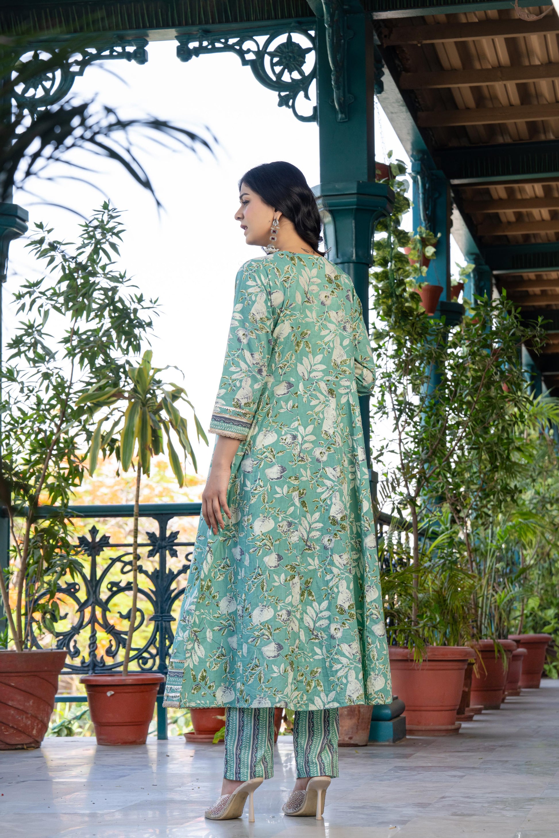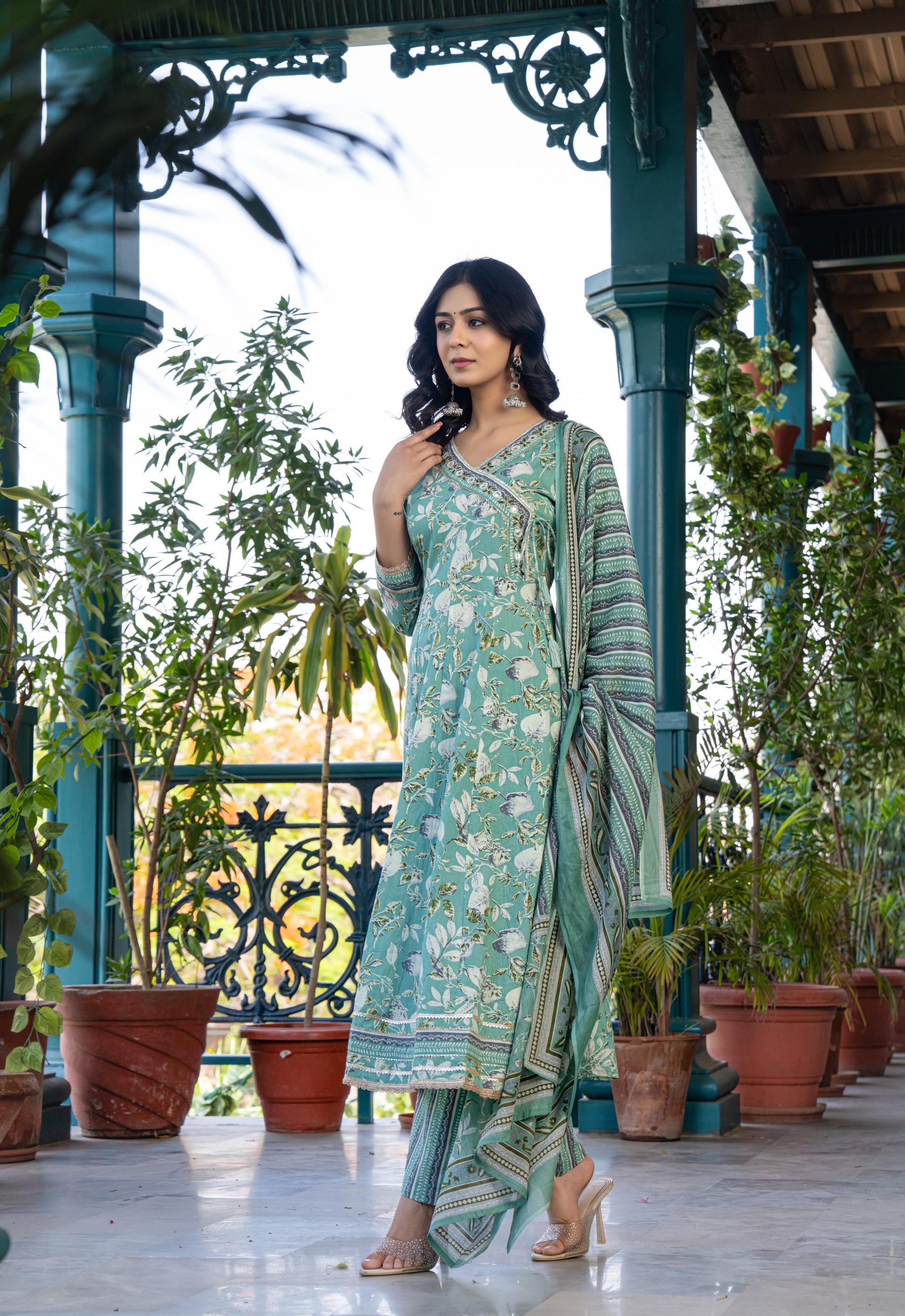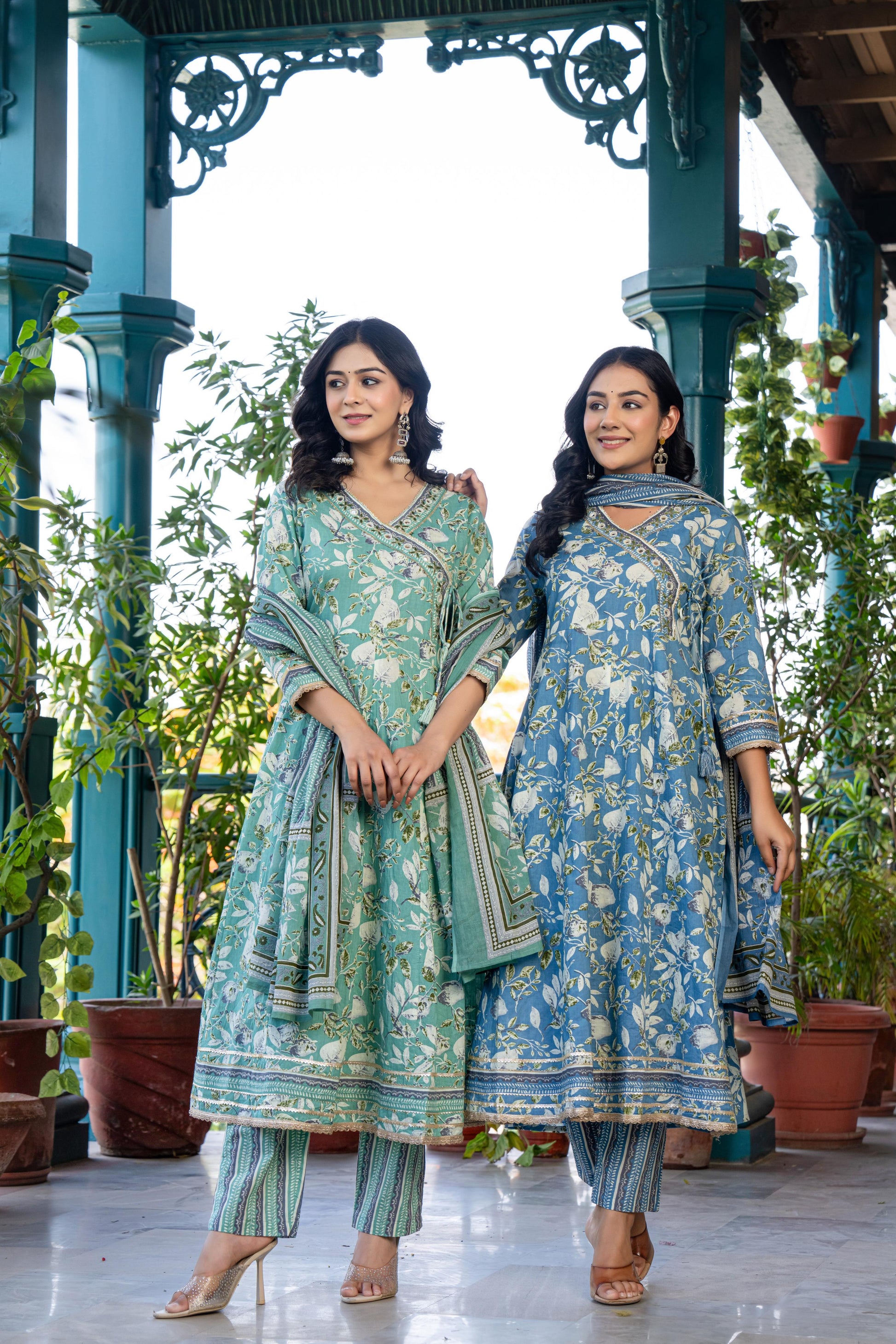 Step into effortless elegance with this soft blue floral cotton kurta set. Featuring delicate embroidery on the neckline and sleeve cuffs, it’s paired with printed straight pants and a coordinated dupatta in contrast floral and stripe patterns—perfect for brunches, festive days, or casual ethnic looks.