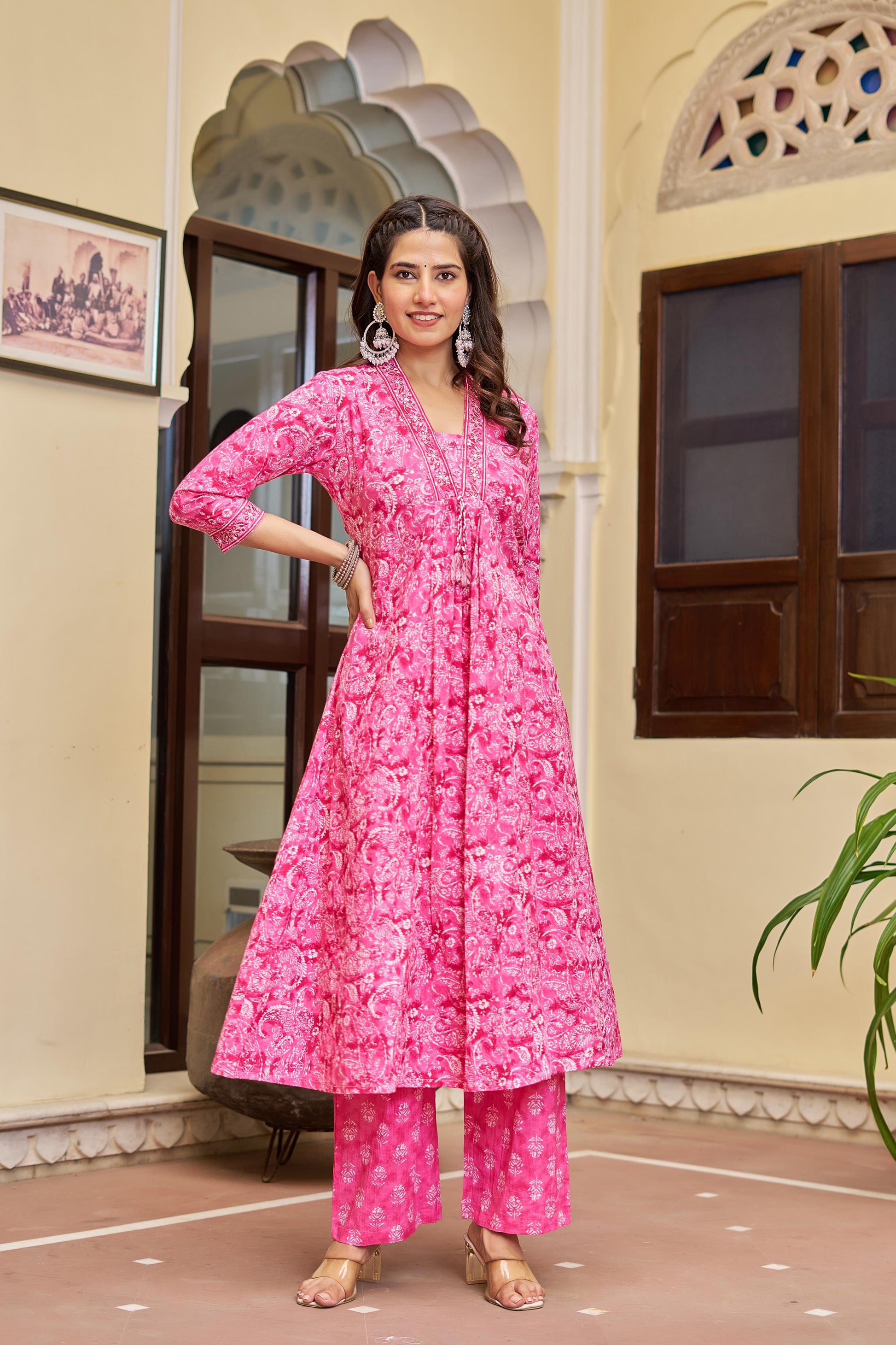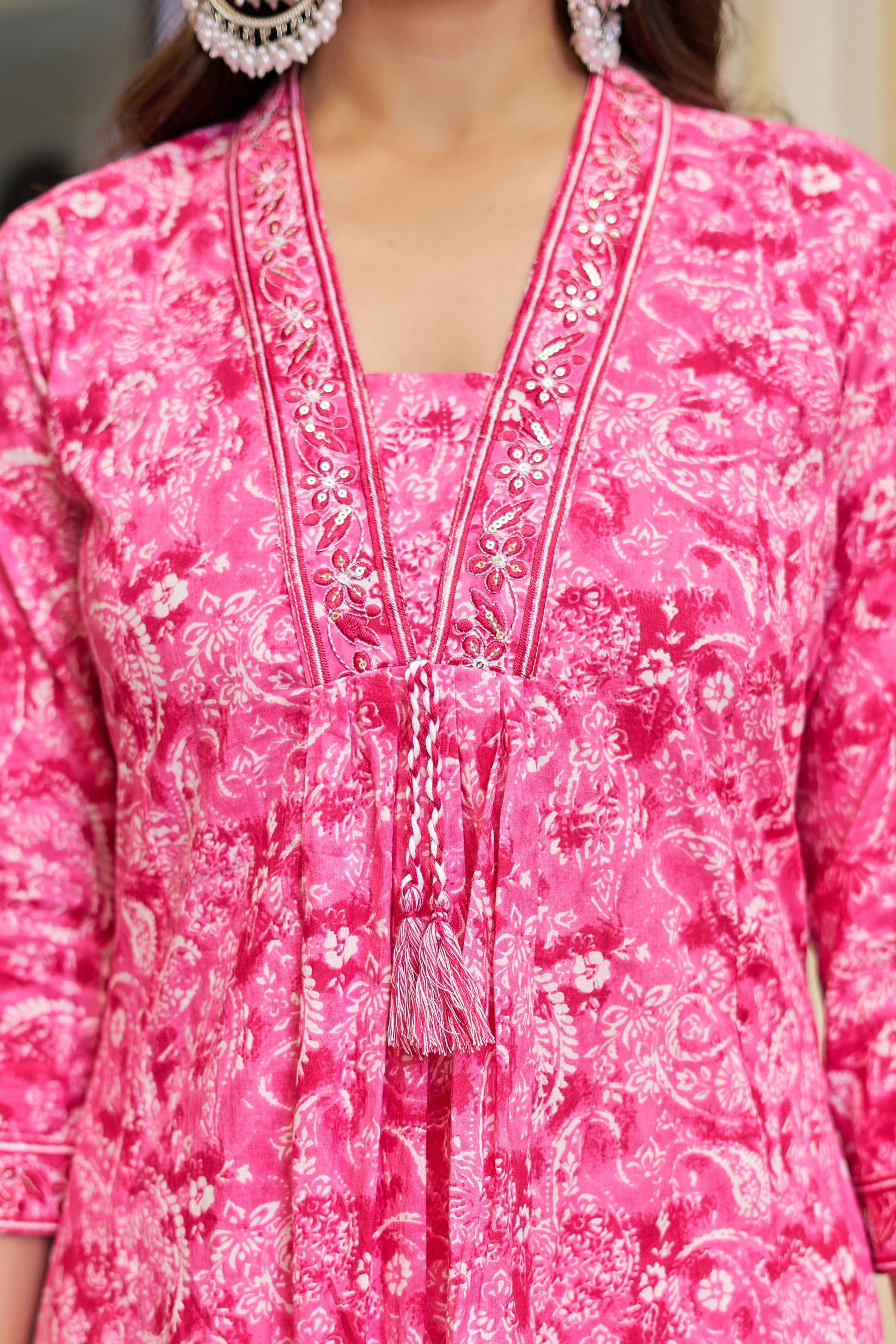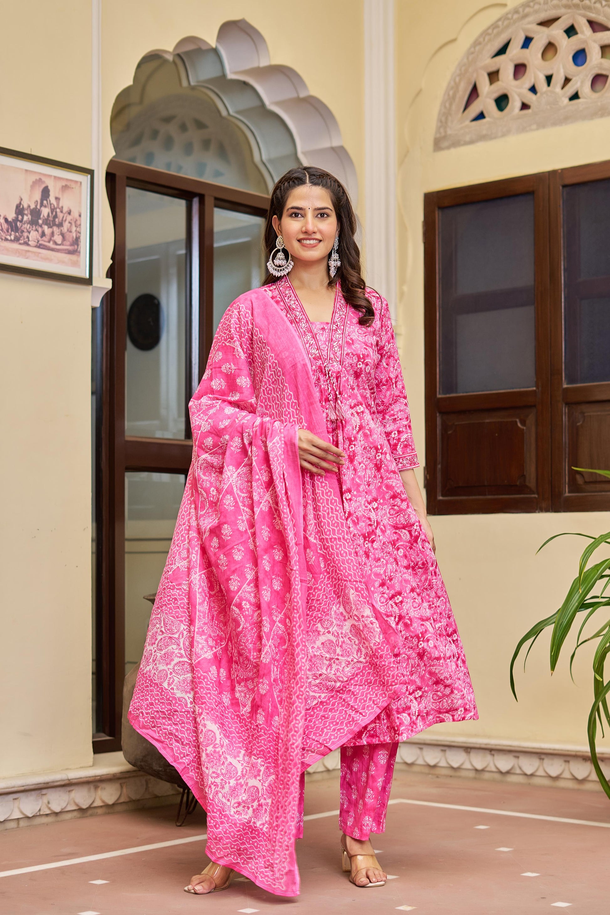 Noorita Pink :- Women's Cotton Kurta Set with Dupatta | Embroidered Neckline & Printed Design