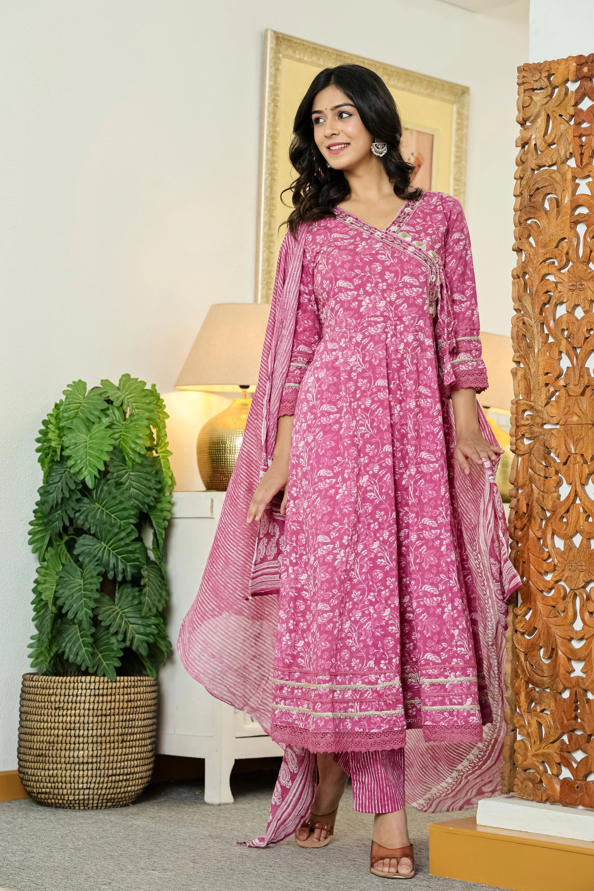 Pink Printed Cotton Anarkali Kurta Pant Dupatta Set