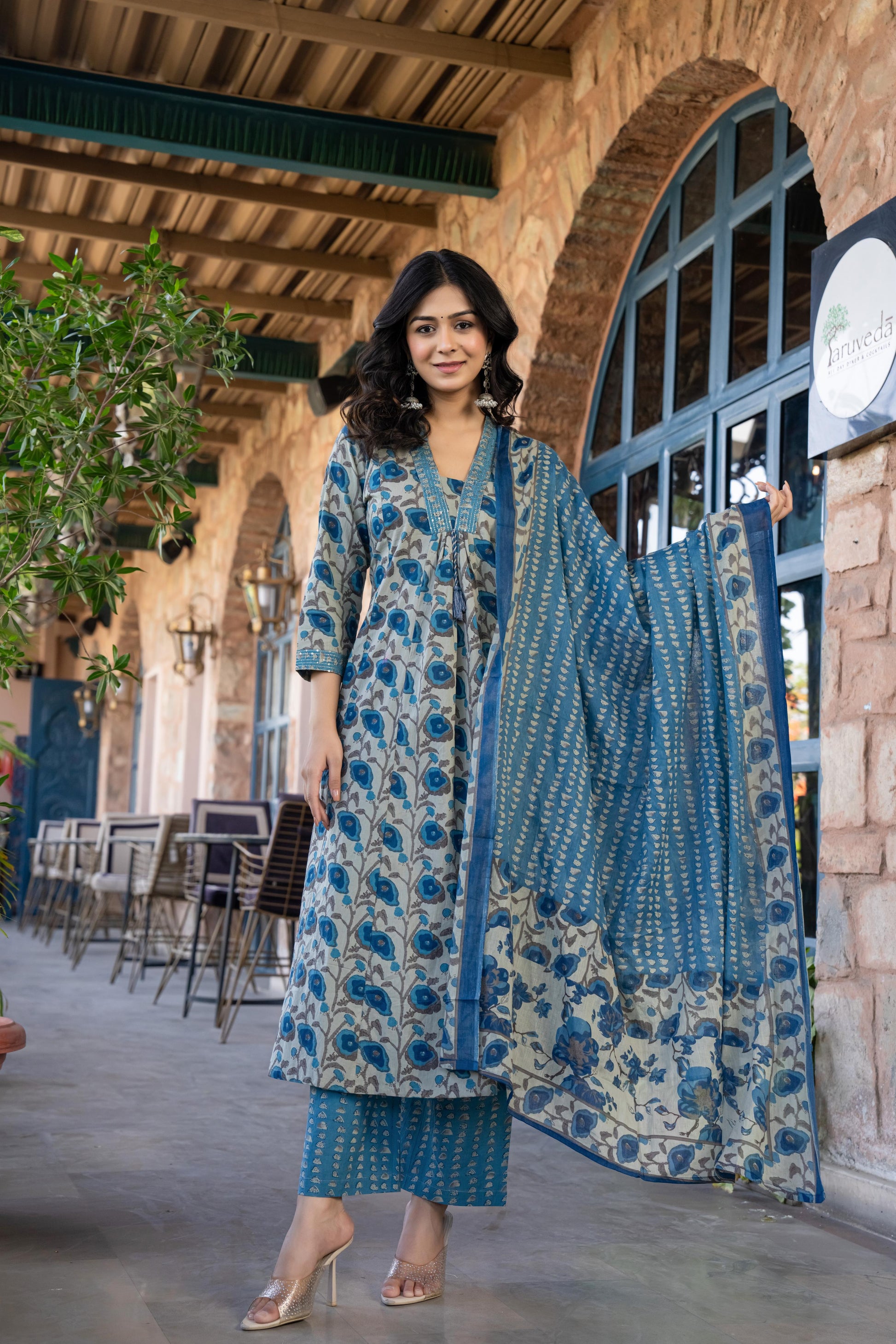 Tavira Women's Floral Cotton Kurta Set with Dupatta | Blue Bloom Print | Thread Work Neckline