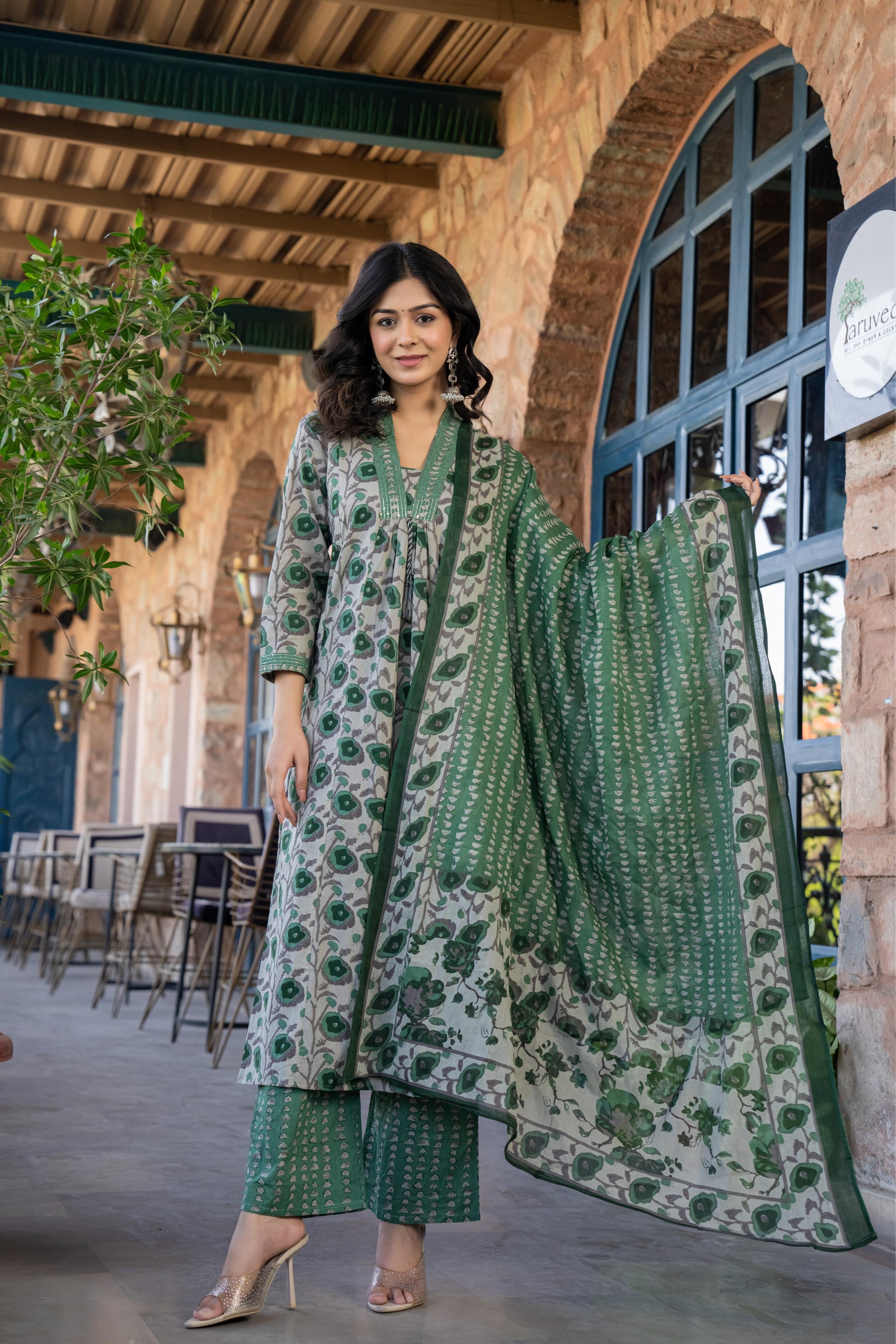 Tavira Women's Floral Cotton Kurta Set with Dupatta | Green Bloom Print | Thread Work Neckline