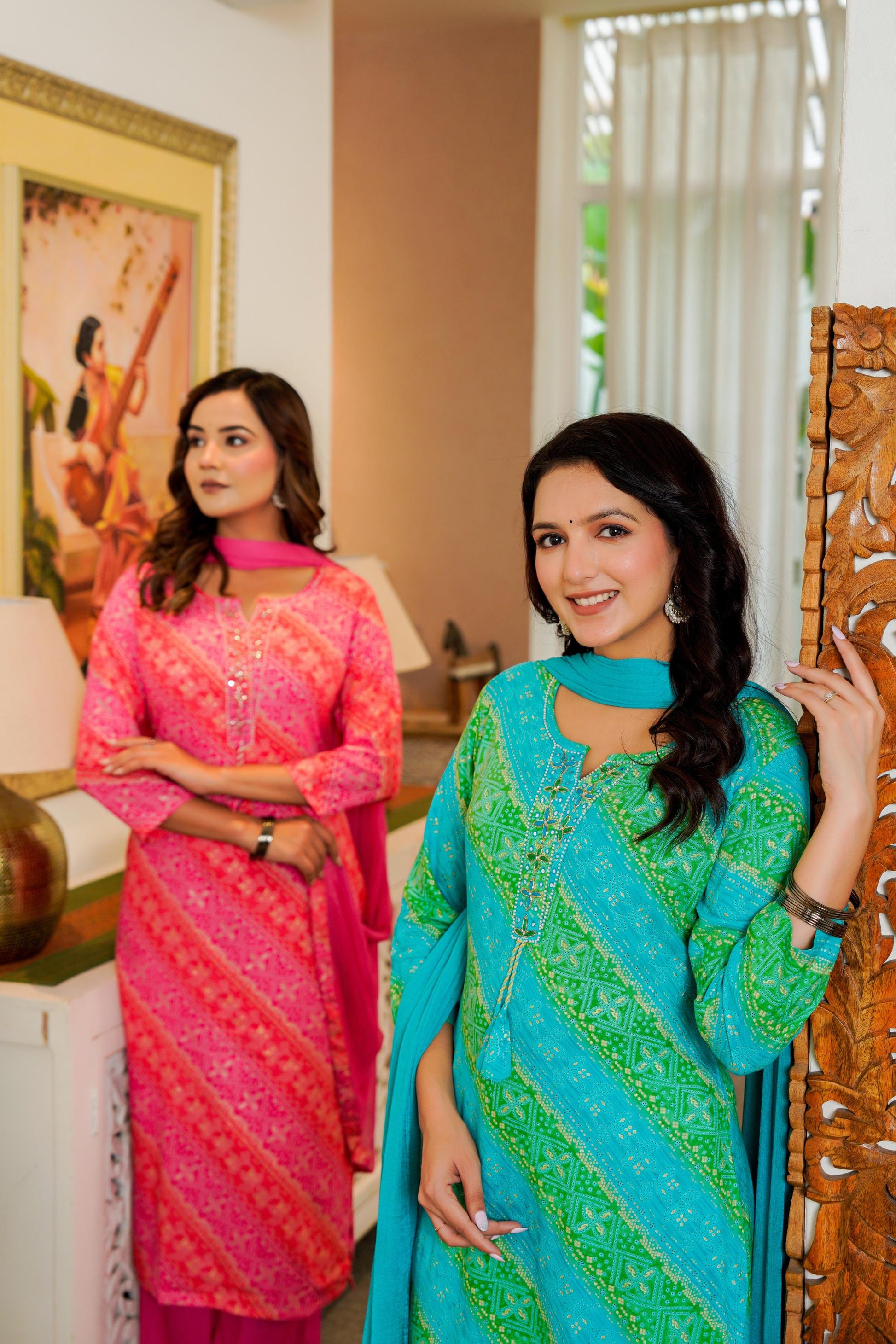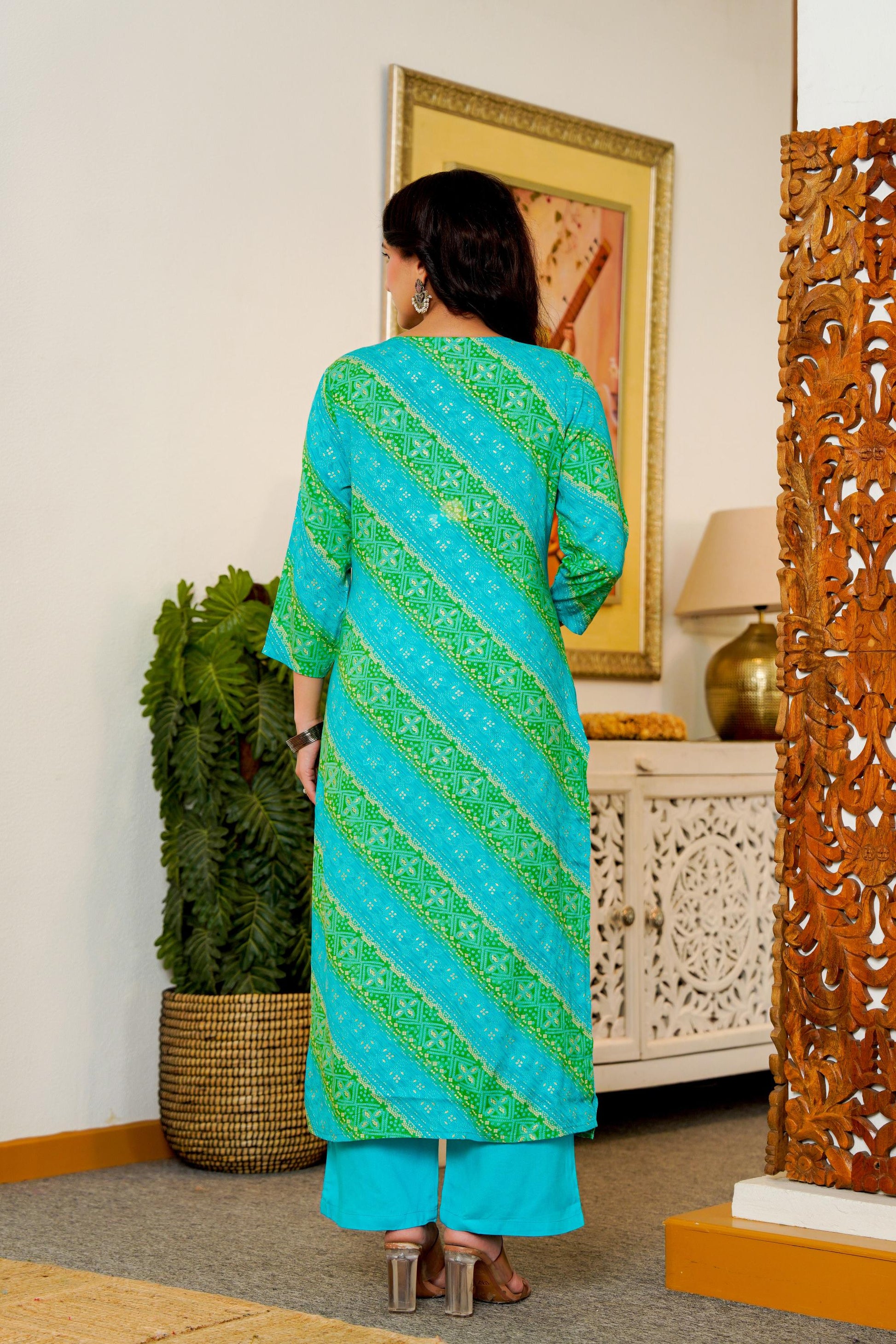 Turquoise & Green Printed Kurta Set with Dupatta – Vibrant Festive Wear