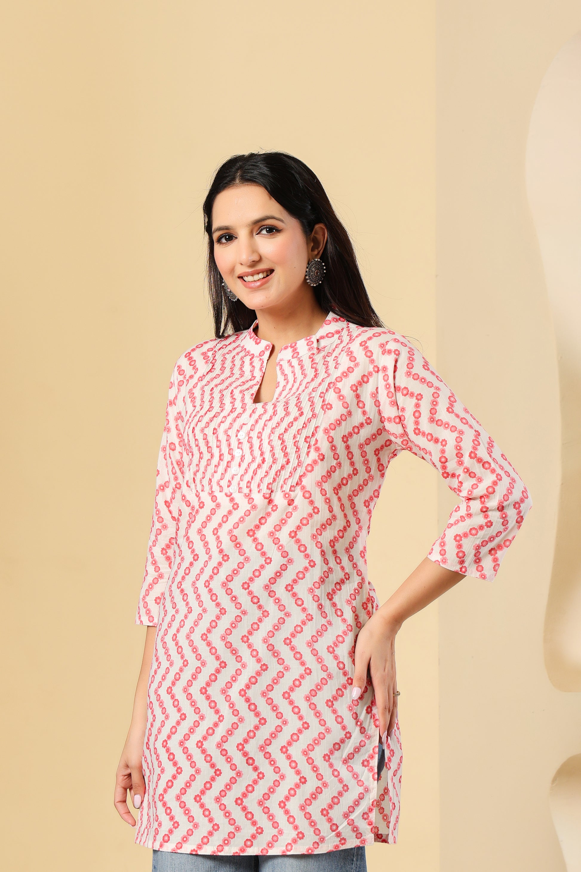 White & Pink Printed Short Kurti for Women